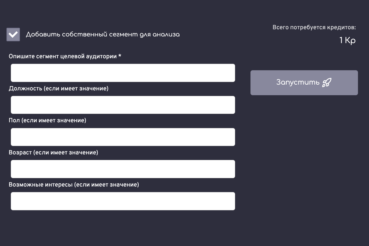 При запуске проекта алгоритм автоматически определяет основные сегменты ЦА, но если у вас появились собственные идеи кто может быть потребителем ваших продуктов или услуг - добавьте эти сегменты в свой проект.
