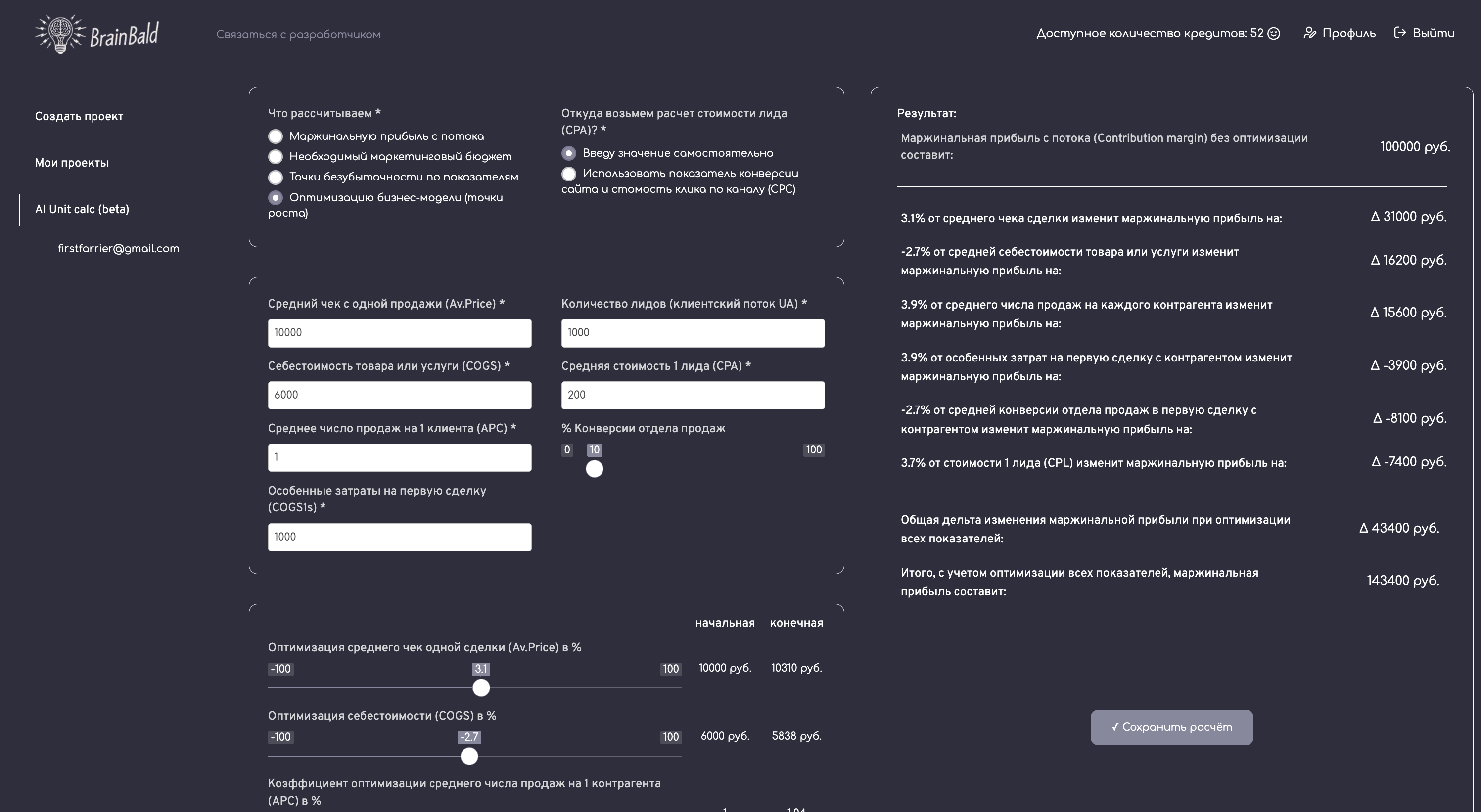 Сейчас калькулятор работает в бета-версии и пока не соединен с ИИ. Мы работаем над обучением ИИ алгоритма для расшифровки результатов расчета и написания рекомендаций по оптимизации бизнес моделей. В дальнейшем это позволит запускать исследование сегментов целевых аудиторий с учетом реальных экономических показателей.